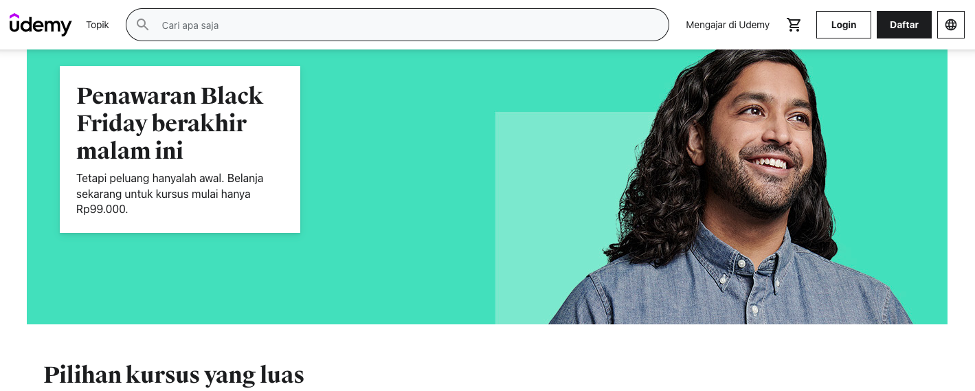 Udemy menyediakan 2000+ kelas dalam kategori pengembangan termasuk beberapa bahasa pemrograman, kursus pengembangan game, ilmu data, dan banyak lagi. Kamu bisa memfilter opsi sesuai kebutuhan-mu.