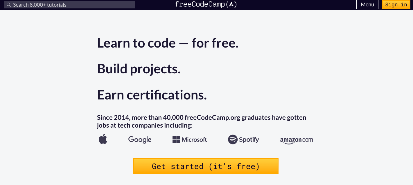 Situs web pengkodean ini memiliki kurikulum kursus 3000 jam dan memiliki 40.000+ lulusan. Situs web ini adalah platform tepercaya terbaik tempat kamu bisa belajar coding secara gratis. freeCodeCamp memiliki alumni terbaik yang akan kamu temui.