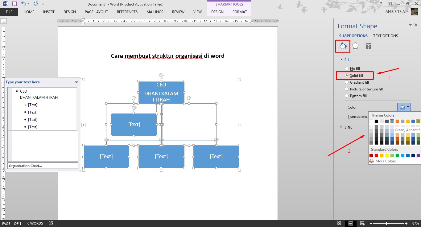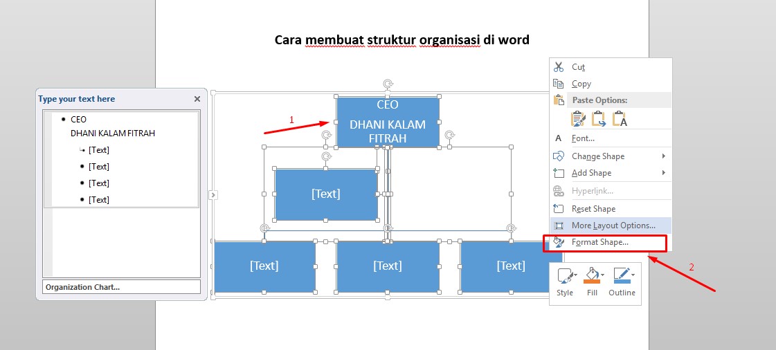 1. Jadi secara otomatis word akan menyeleksi warna untuk kotak-kotak pada struktur yang kita tetapkan tadi. Namun ini tidak permanen, bisa kita ganti sesuai dengan keinginan kita. Cara mengubah warnanya yaitu dengan cara menandai terlebih dahulu semua kotak dengan cara klik Ctrl + A. Setelah semua kotak ditandai maka klik Format Shape.