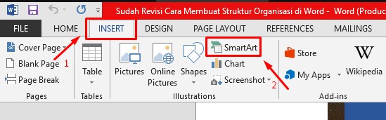 1. Buatlah satu dokumen kosong baru, beri judul kemudian klik menu Insert – SmartArt