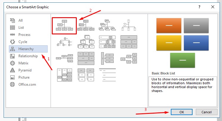 1. Setelah kita mengeklik SmartArt maka akan muncul jendela baruDisini terdapat banyak opsi pada sebelah kiri. Pilihlah salah satu opsi, yaitu Hierarchy lalu pilih format sesuai dengan organisasi atau perusahaan yang akan anda buat.